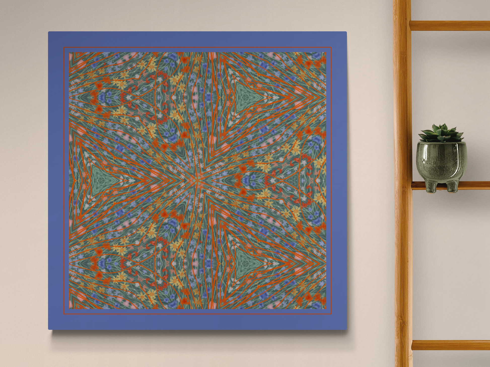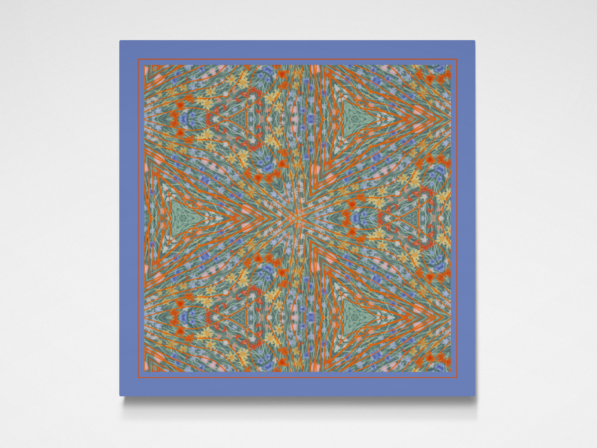 Inspired by retro revival and 70s psychedelic art, this pattern vibrant kaleidoscopic pattern that captures the free-spirited energy of the era. Bold orange lines weave through energetic florals, creating a retro floral design that blends hippie-inspired elements with modern confidence. This psychedelic floral pattern combines earthy, flower hippie vibes with bold, empowering colours.