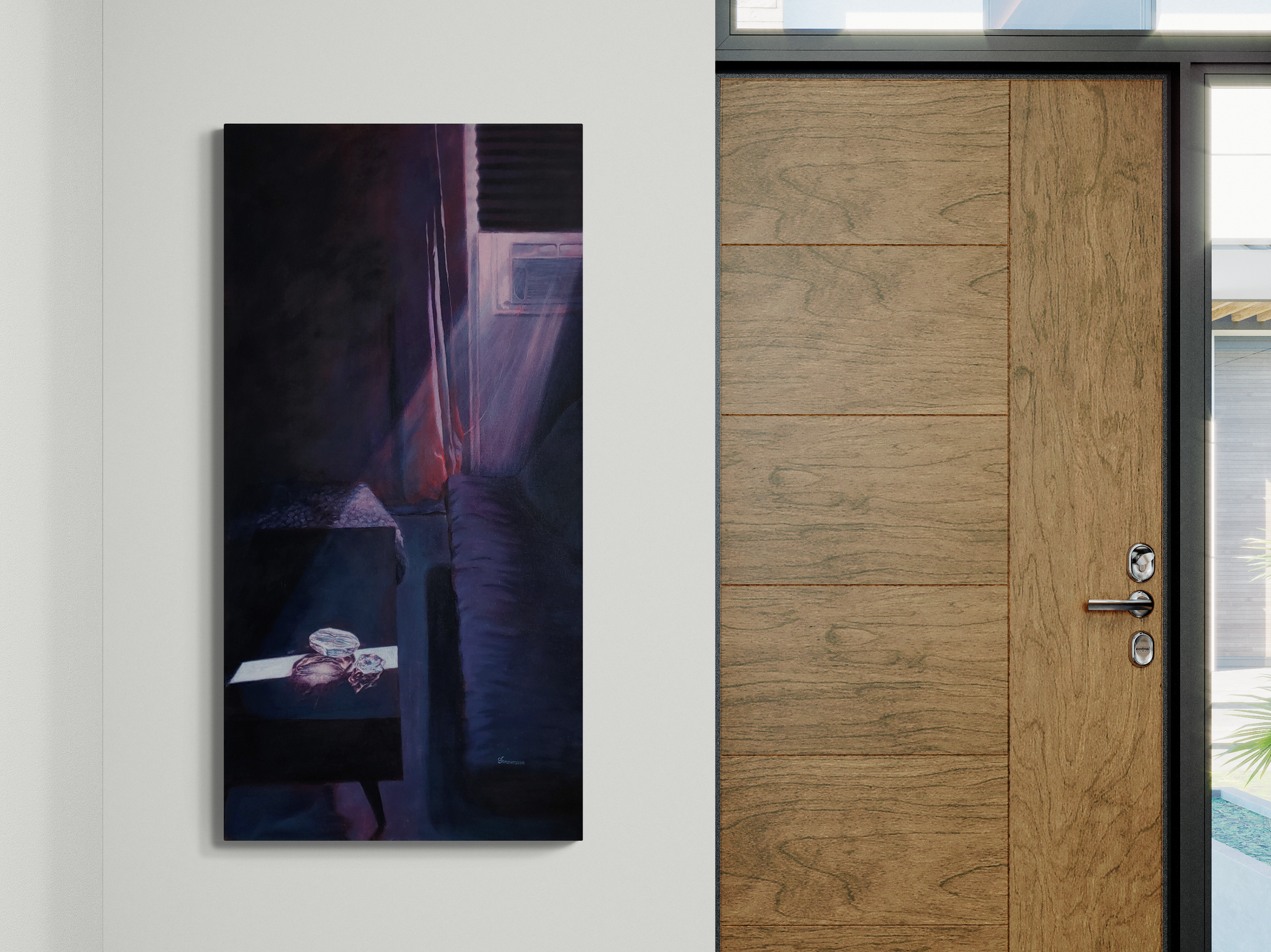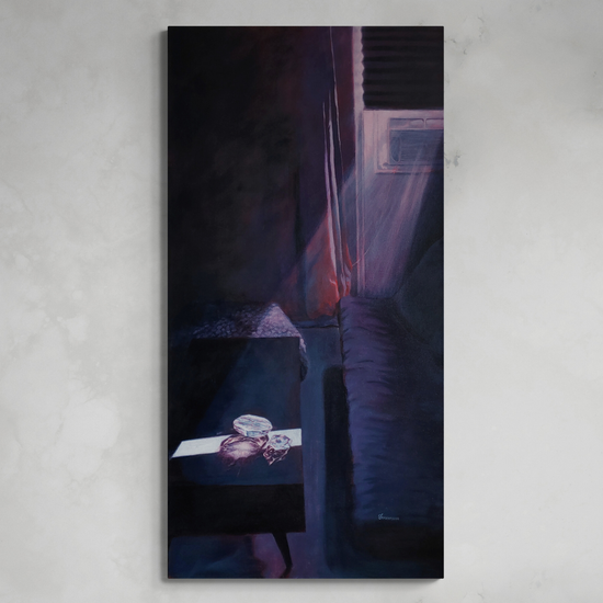 The scene depicts this shift through the atmosphere of a morning-lit apartment, where a ray of light illuminates mysterious crystalline objects on a coffee table. The gem like objects create beautiful caustic light patterns on the surface they sit on. Painted in deep blues, jewel-tone purples, and glowing pinks.