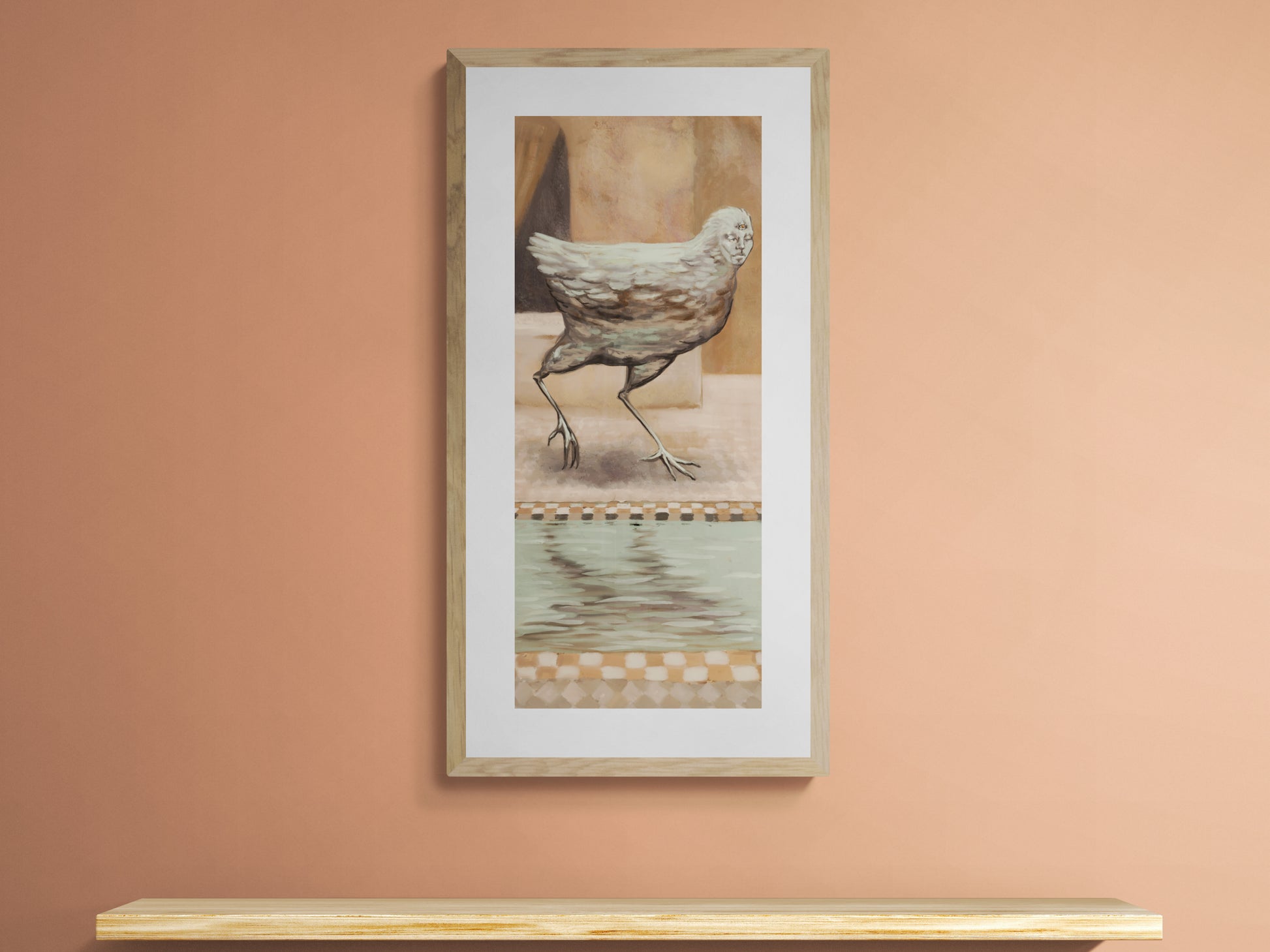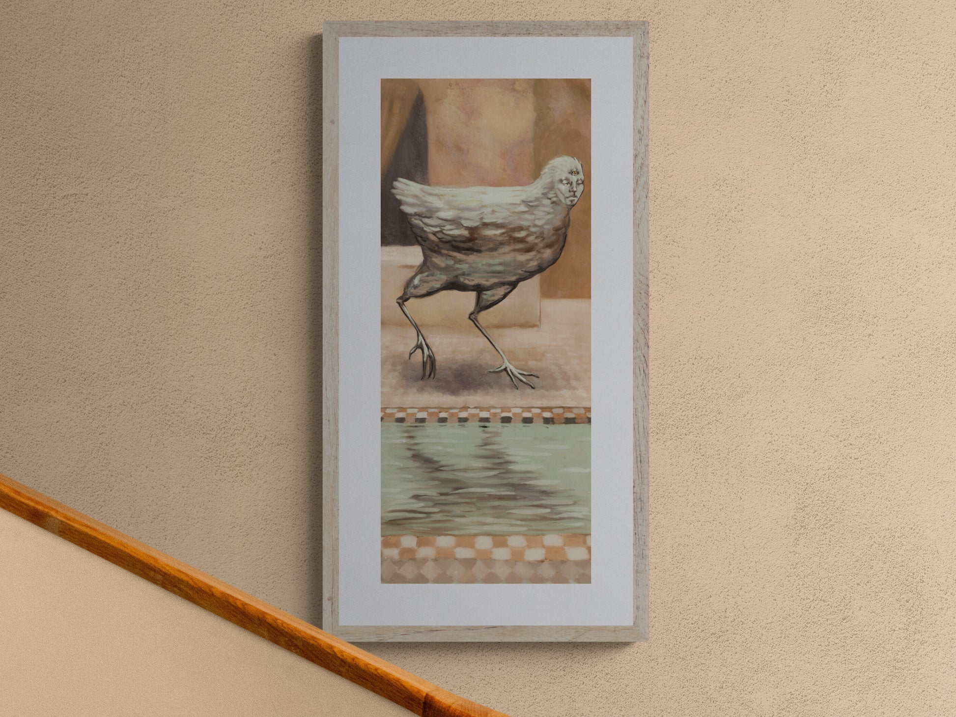 This art print features a surreal silver bird, a magical creature with three eyes in a desert courtyard. This dark fantasy harpy has two eyes closed and one watchful eye open, a wise spirit with mysterious motivations from ancient myths. Perfect for game rooms or anyone who loves bizarre art, this piece captures the moment when the creature chooses to reveal itself to you.