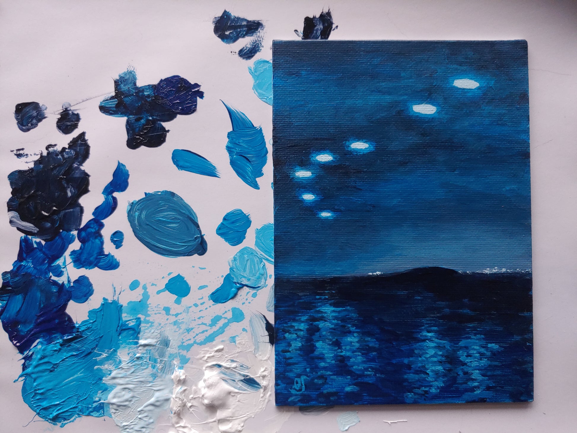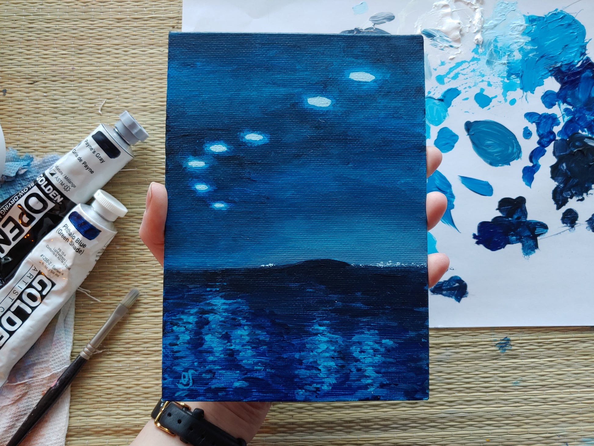I painting this acrylic painting to capture the mystery of UAPs. They are seen in formation, hovering over the water with a city in the distance. You decide what their intentions might be.