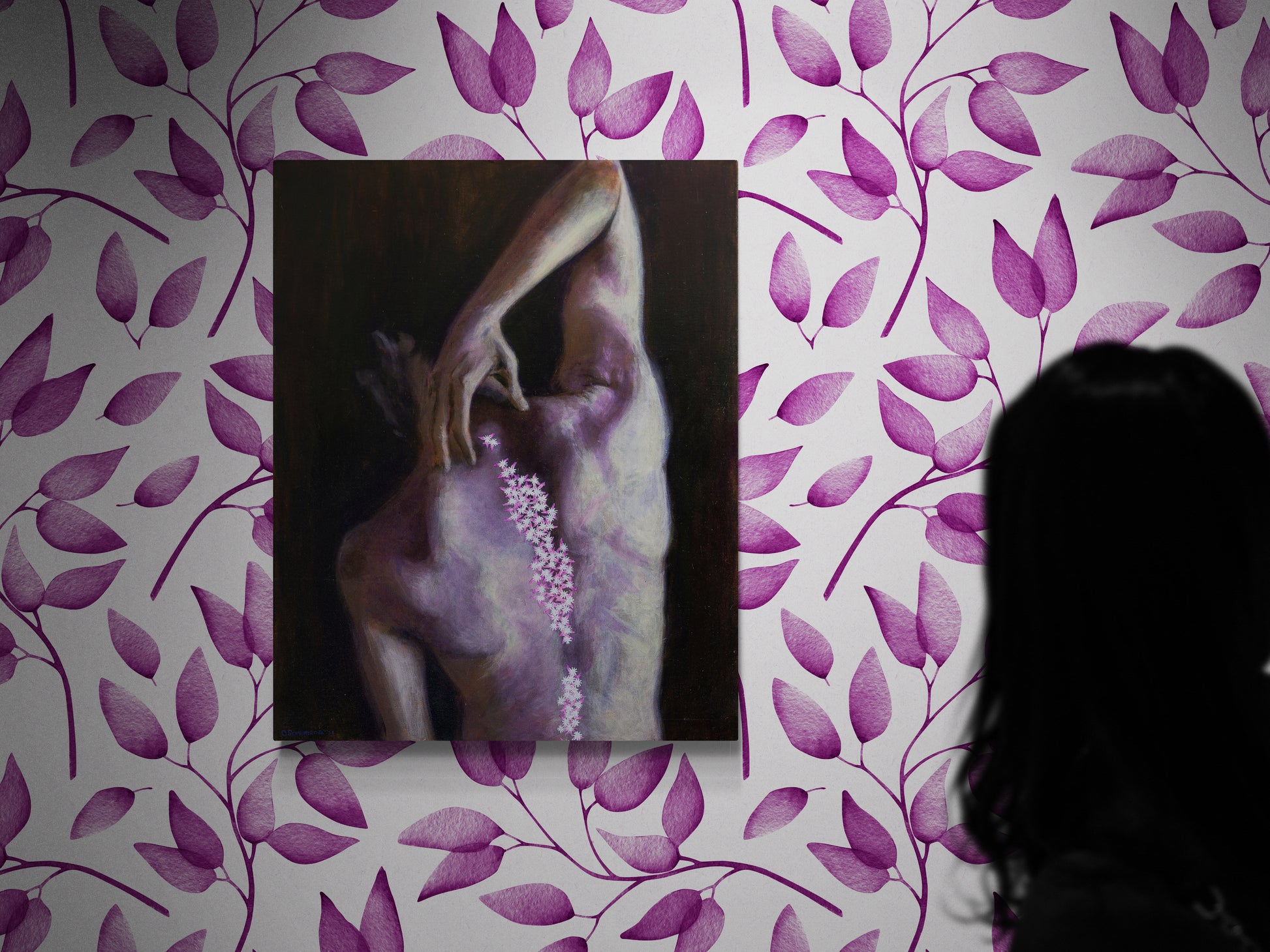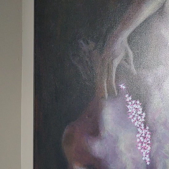 This original male figure painting portrays a masculine form adorned with flowers against a dark backdrop. I hand-painted this sensual art piece, blending figurative and surreal elements that blur the lines between reality and dream. The moody purple tones create bedroom wall art that invites viewers into an otherworldly realm, exploring themes of modern masculinity through a surreal lens.